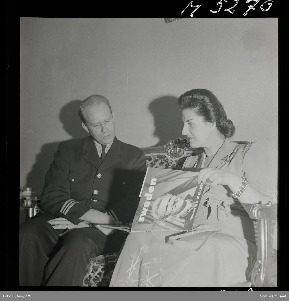 Istanbul. En kvinna sitter i en soffa och läser i boken "Sweden" av K W Gullers, en man i pilotuniform sitter brevid.
