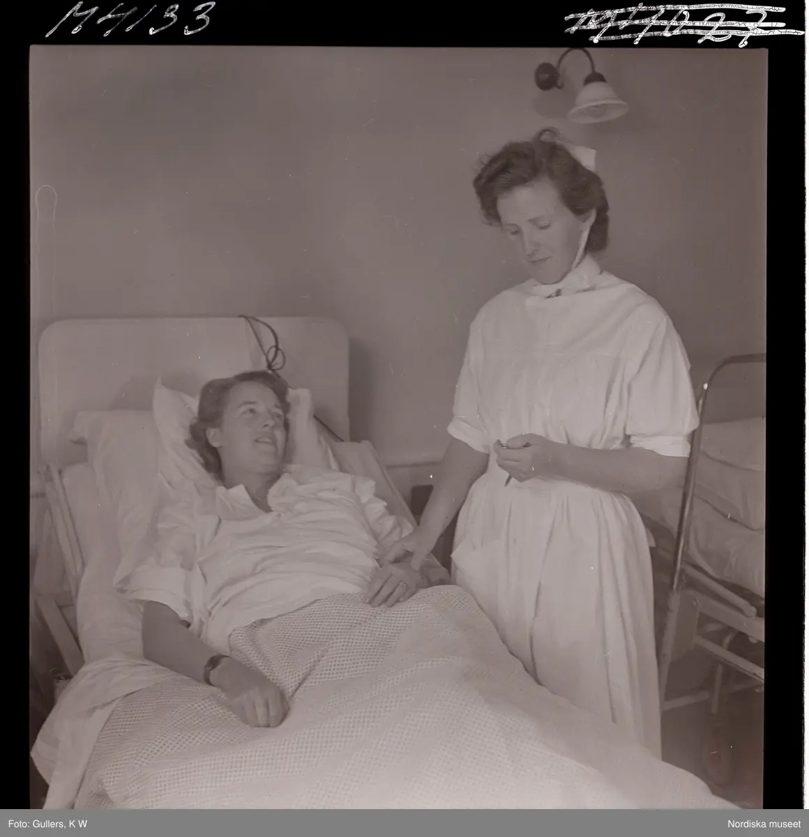 1711 En sjuksköterskas arbetsdag. En sköterska undersöker en patient i säng.
