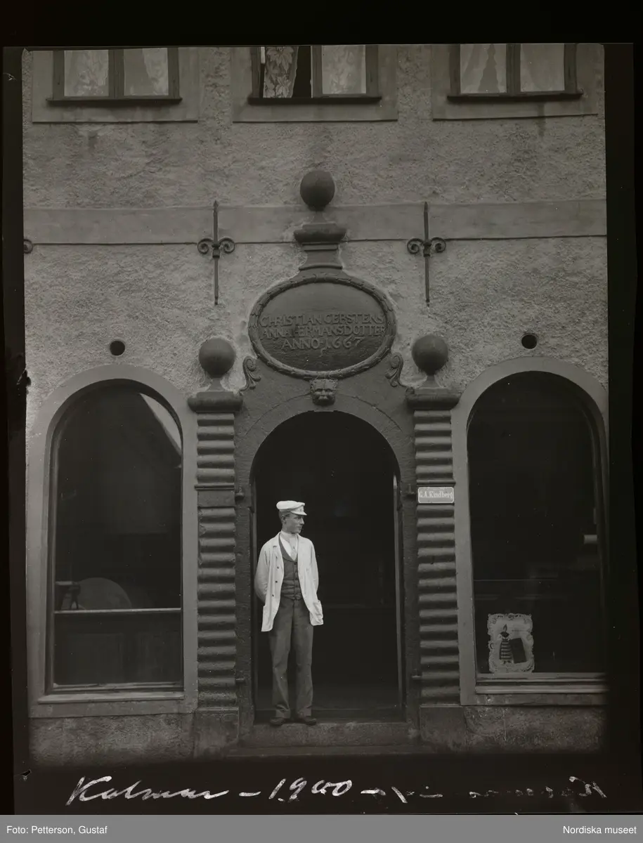 I porten till Castens (Christian Cerstens) gård står en man i vit keps och vit arbetsjacka. Storgatan, Kalmar.