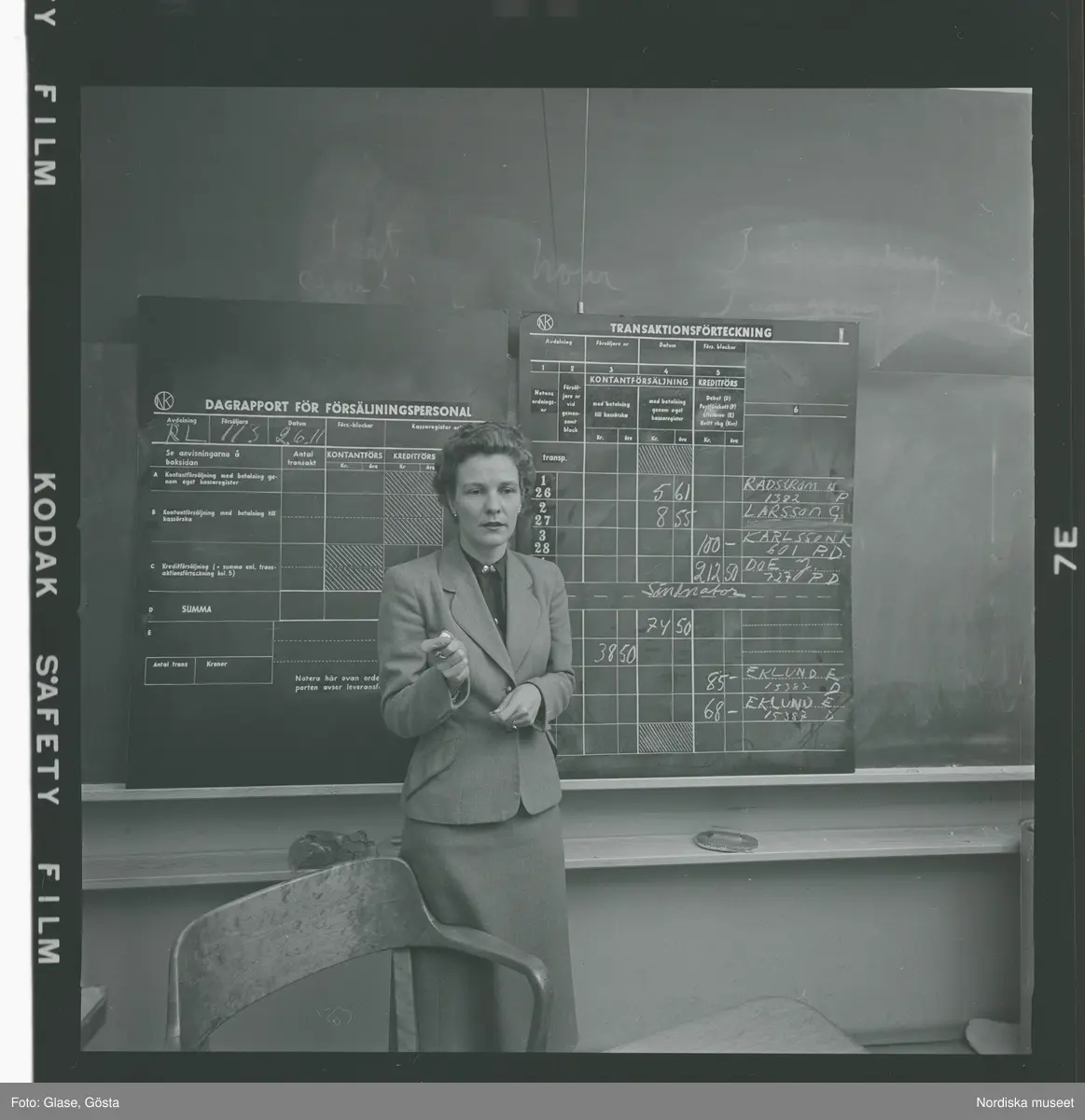 En kvinna framför en svart tavla med en krita i handen. På tavlan finns tabeller för NK/ Nordiska Kompaniets försäljningspersonals dagrapport och transaktionsförteckning, som håller på att fyllas i.