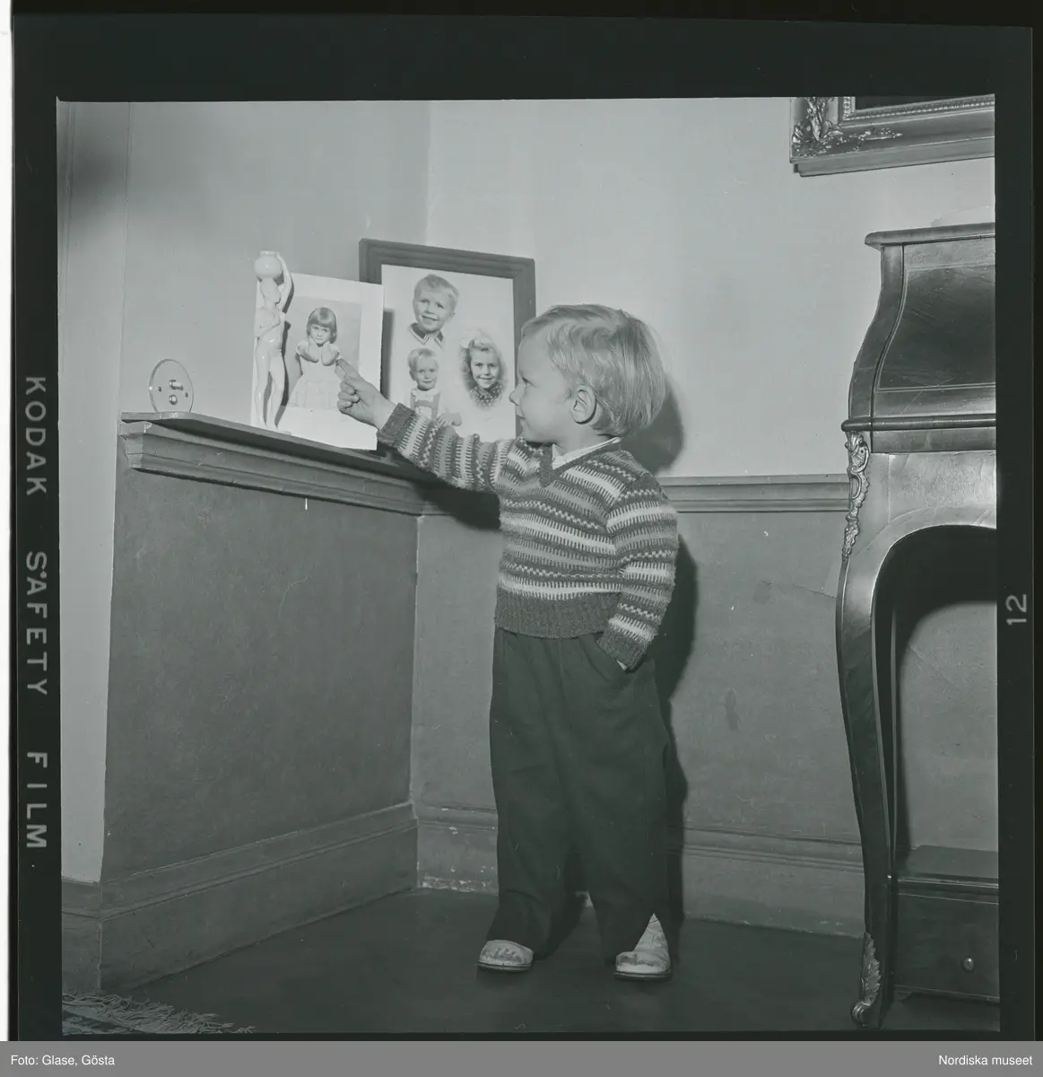 En liten pojke står framför ett par inramade fotografier av barn.