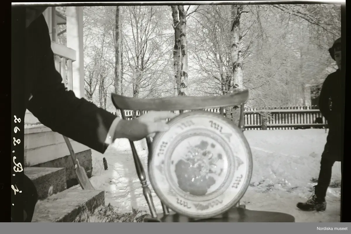 Ett målat fat vilar mot en stol som står ute i en trädgård. Fatet förevisas av en man, endast hans ena hand syns i bild. En pojke kymtar i bildens högra kant.