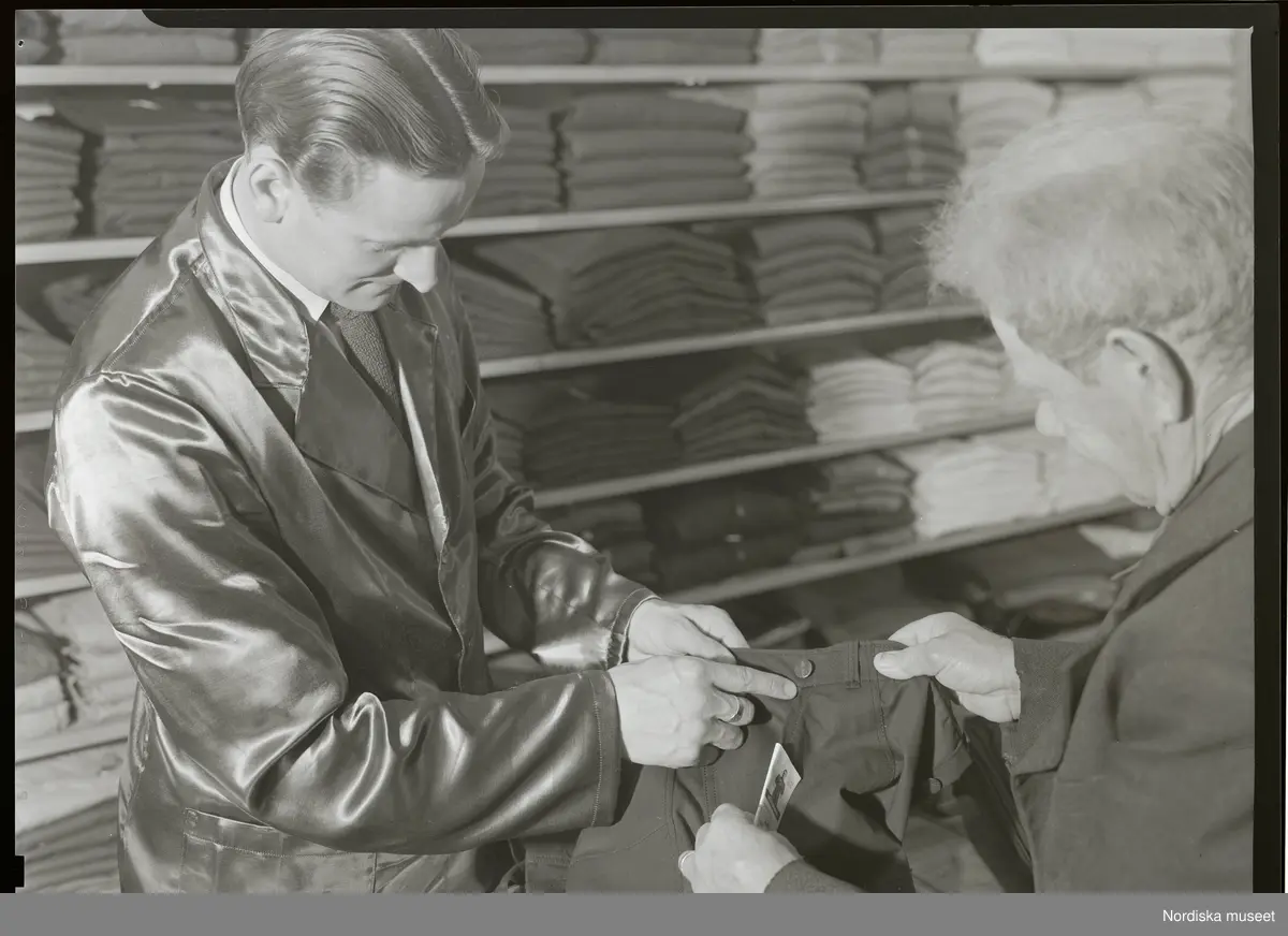 En expedit visar detaljerna på ett par byxor för en kund, i en butik för arbetskläder. Dokumentation av Slitmanfabriken ABs verksamhet.