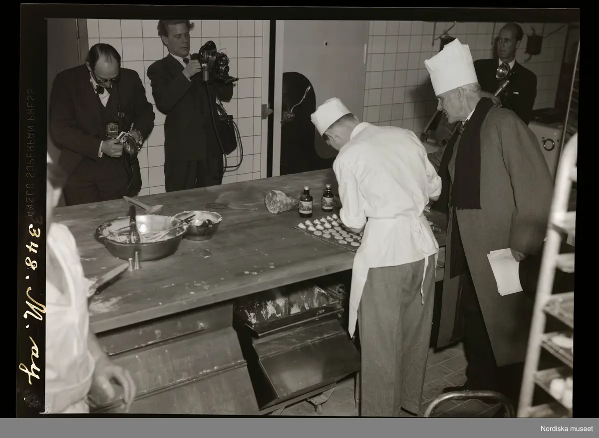 Kockar arbetar vid ett bord i ett storkök. Framför står två män och fotograferar.