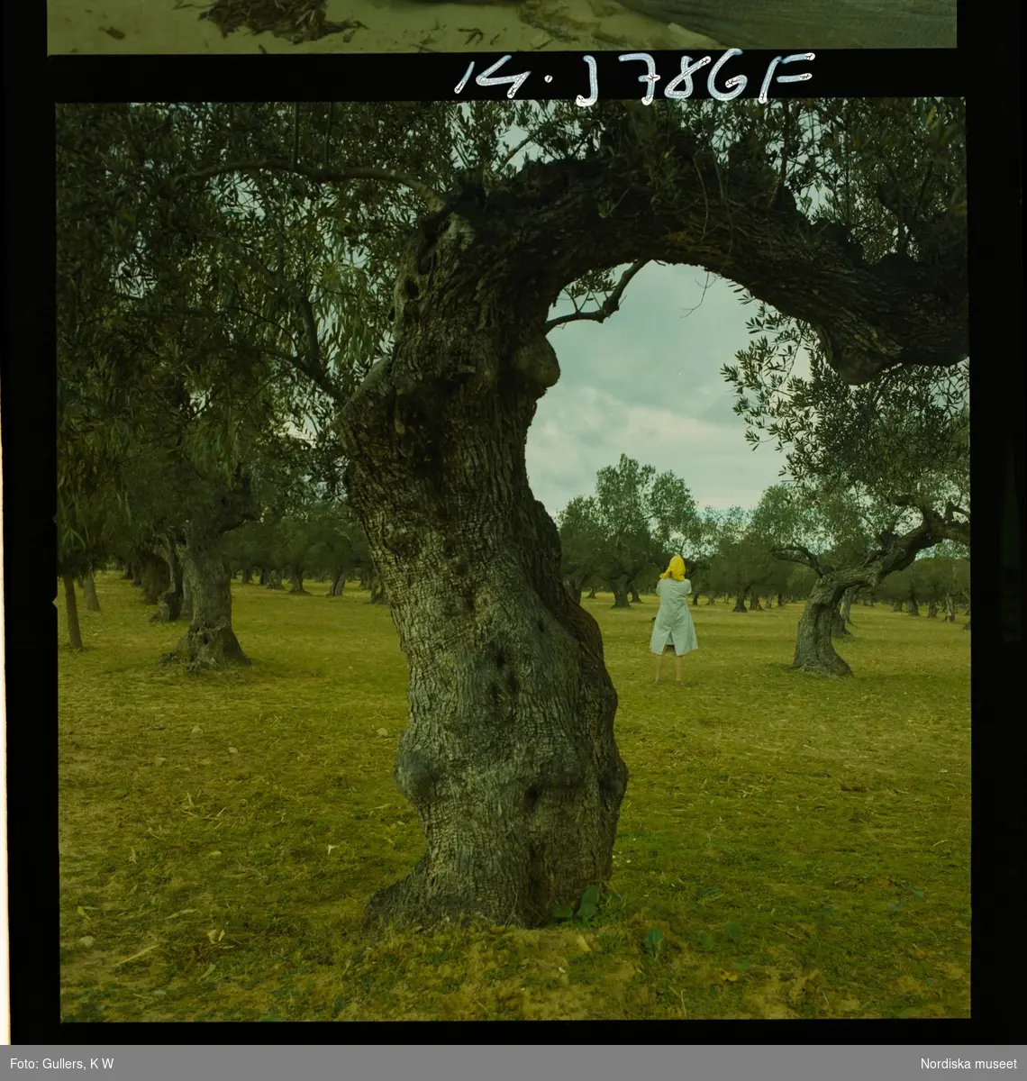 2791 Tunisien Kartago. En kvinna står bland rader av olivträd.