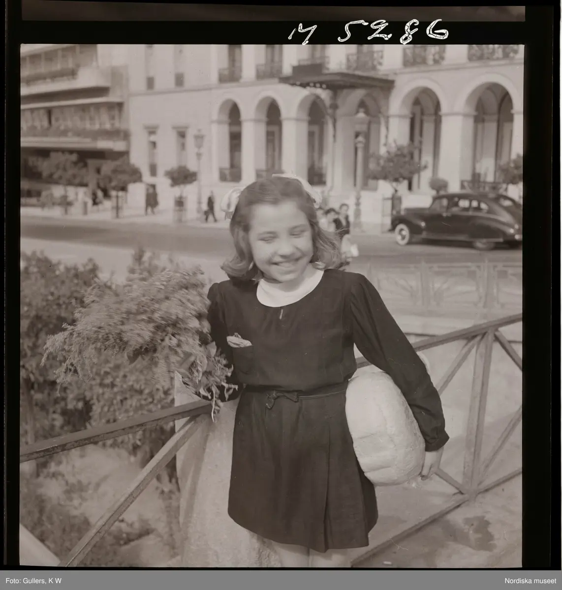1717/H Aten. Porträtt av en skrattande flicka med en bukett i handen och ett bröd under armen.