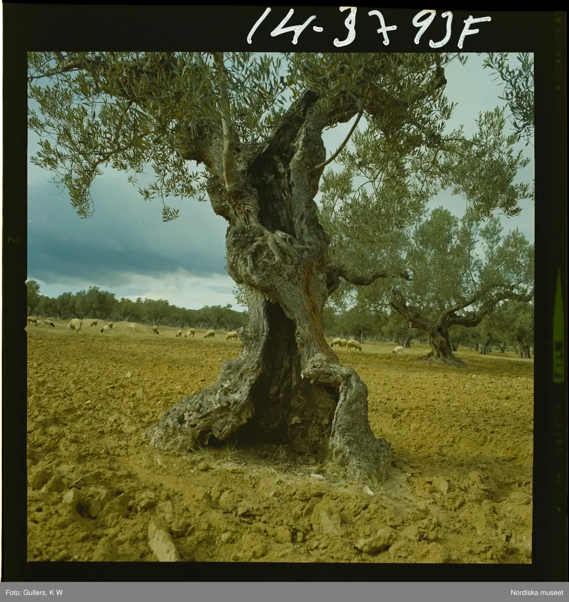 2791 Tunisien Kartago. Gammalt olivträd. Får betar under träden i en olivlund.