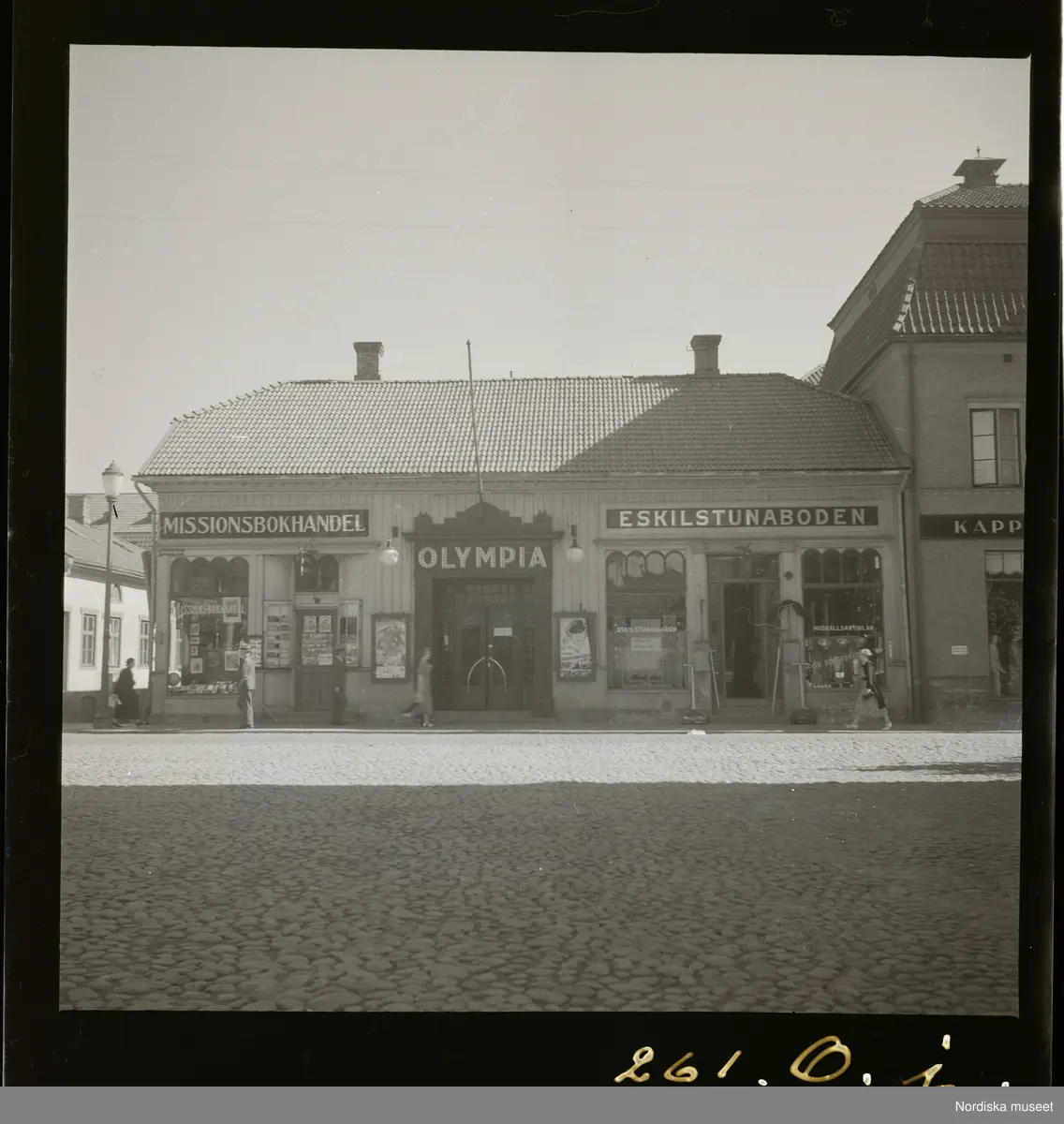 Gatubild. Byggnad med skyltar: Missionsbokhandel. Olympia. Eskilstunaboden.