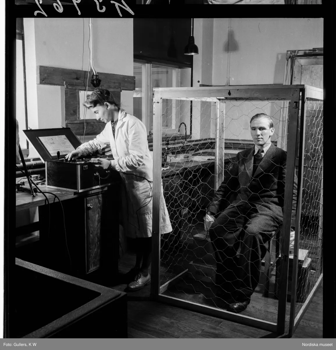 507 D Ultuna. Forskning. I ett labb sitter en man i bur.