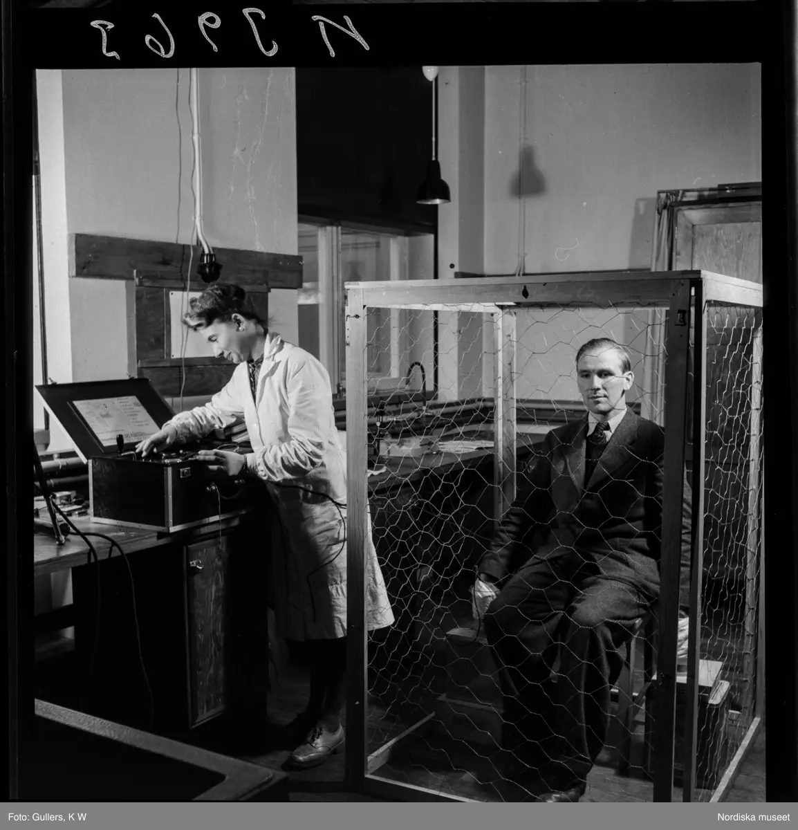 507 D Ultuna. Forskning. I ett labb sitter en man i bur.