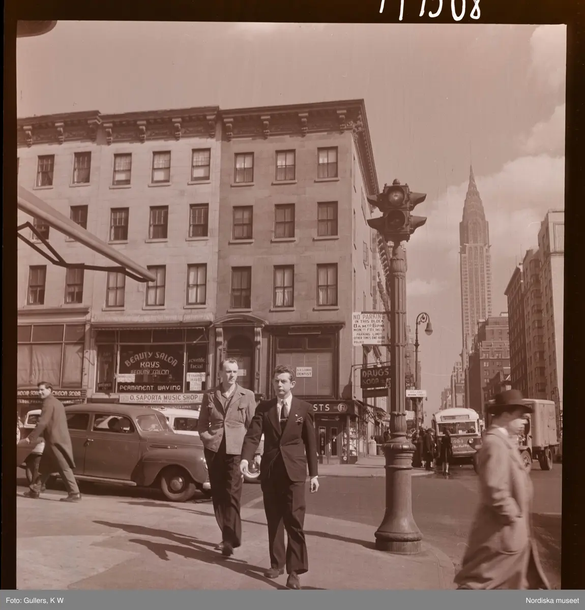1690 New York, allmänt. Gatubild. Ett par män har just passerat ett övergångsställe. Chrysler building syns i bakgrunden.