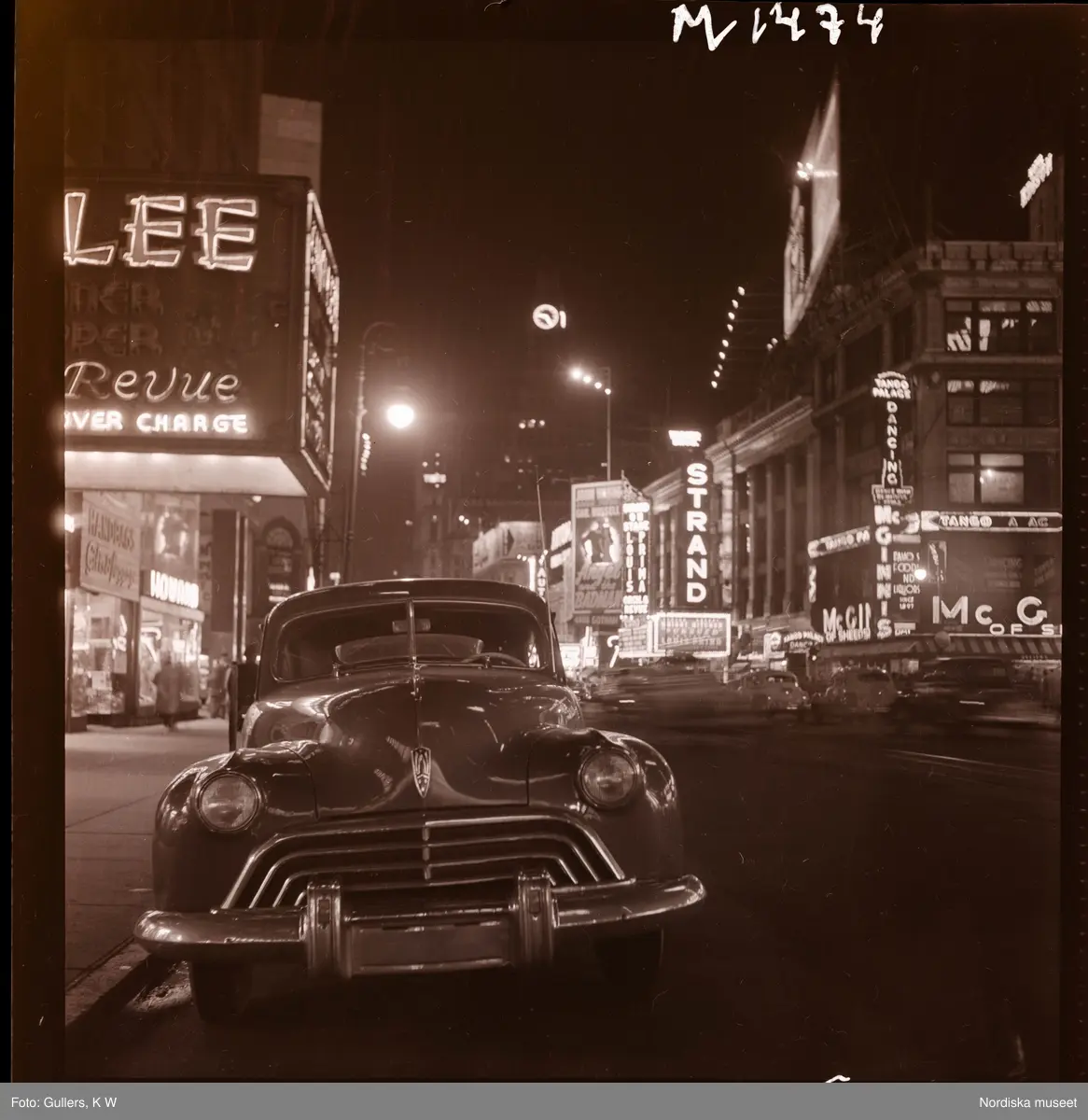 1690 New York, allmänt. Gatubild nattetid. Neonljus, reklam, bil parkerad i förgrunden.