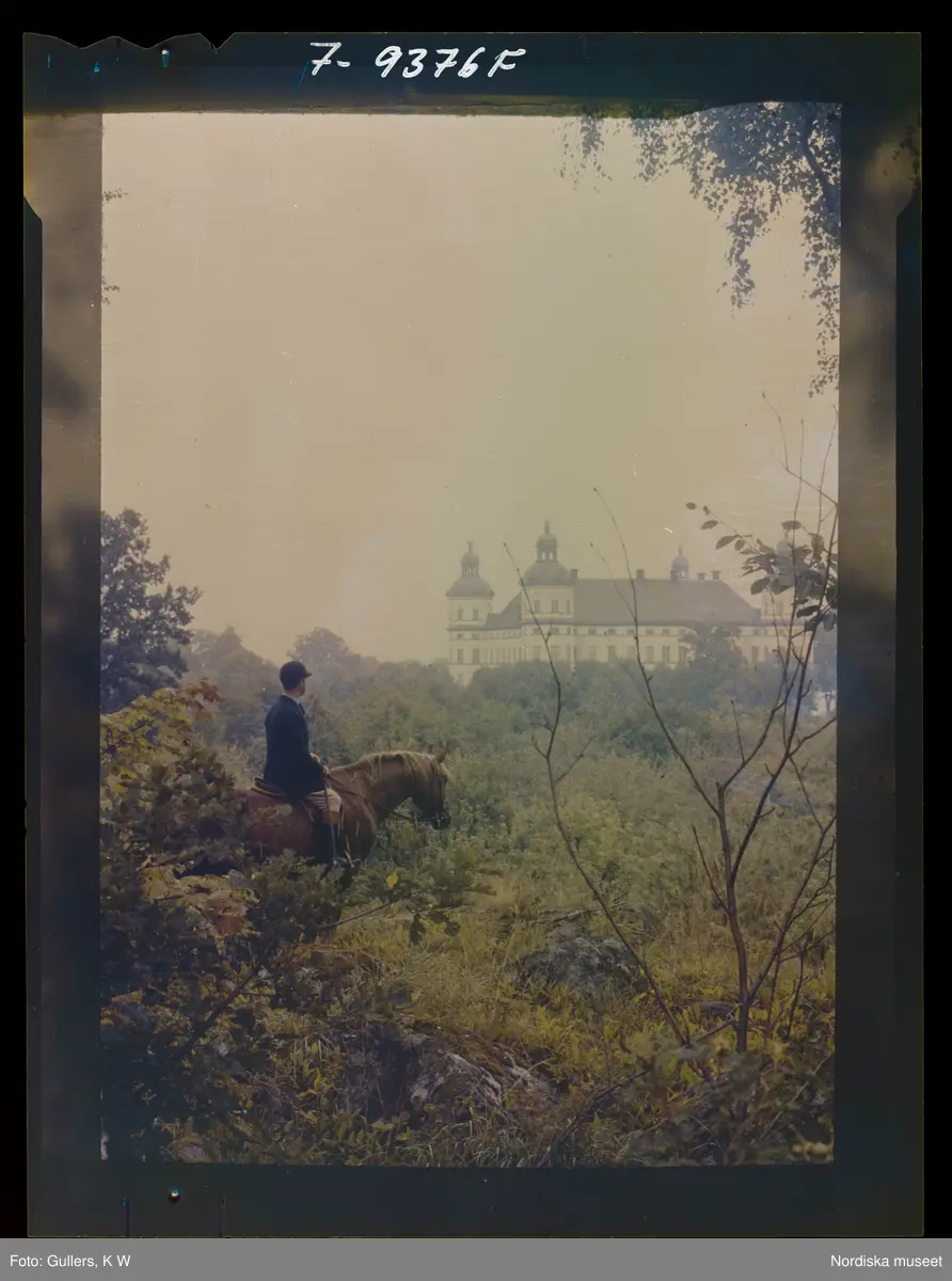 2358/43 Historieboken. En ryttare till häst, i bakgrunden Skokloster slott.