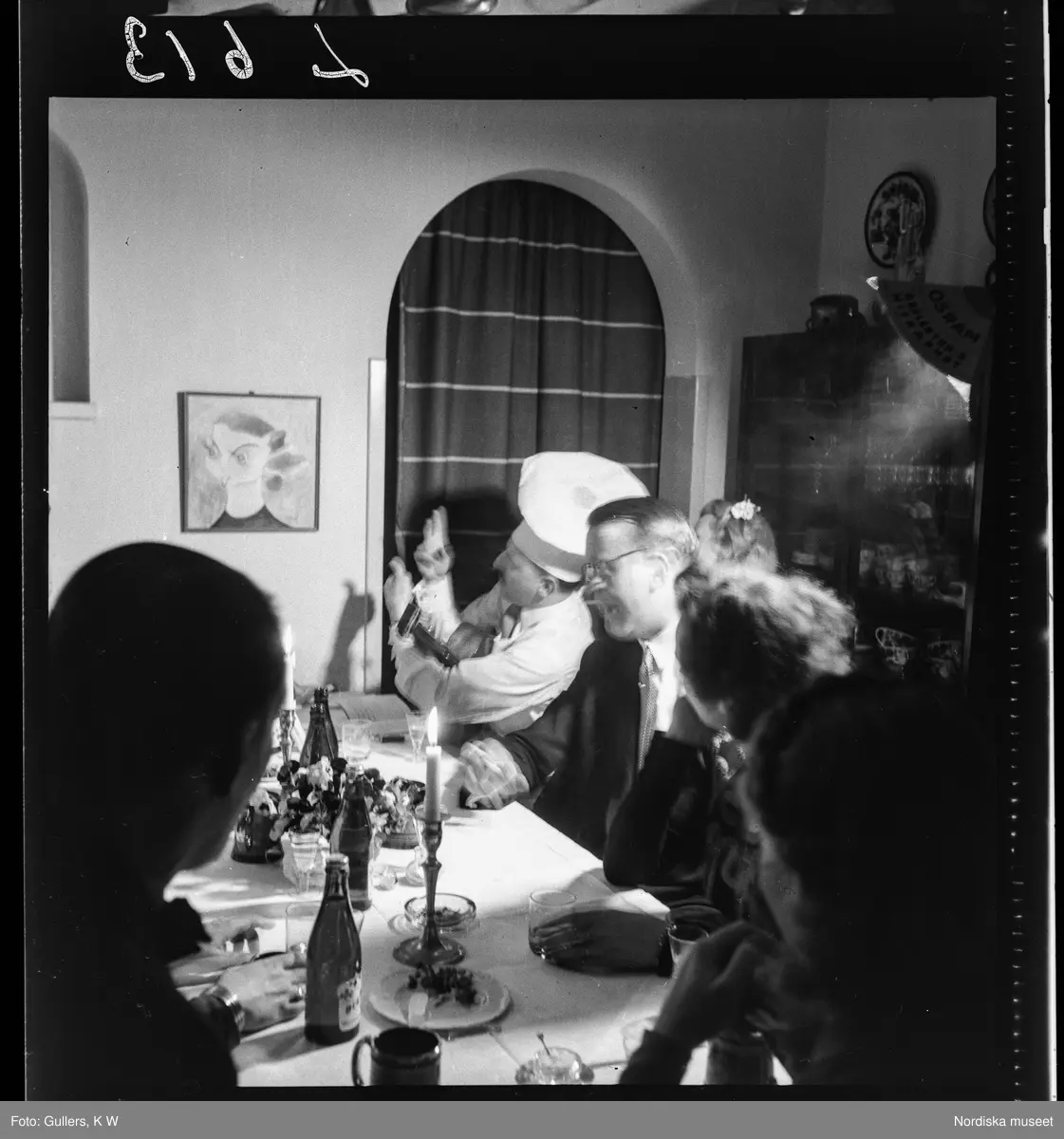 513 C Red. Karlströmer. Festlig stämning kring ett matbord. Ett sällskap roar sig.