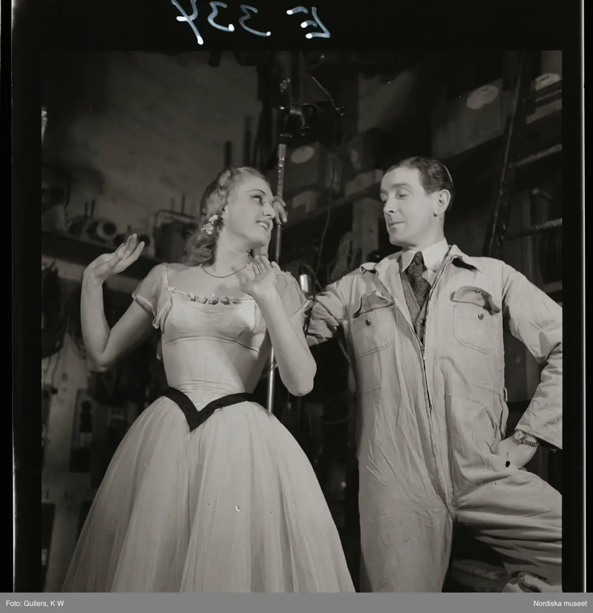 561 Operan för Allers. En kvinnlig dansare i kostym och en man i arbetare-overall, bakom kulisserna.