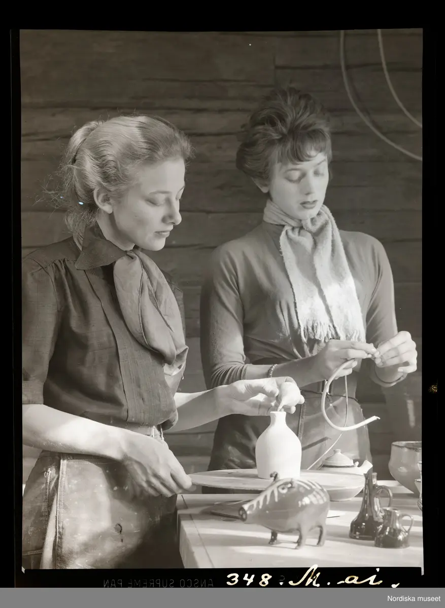 Två unga kvinnor vid ett bord med keramikföremål.
