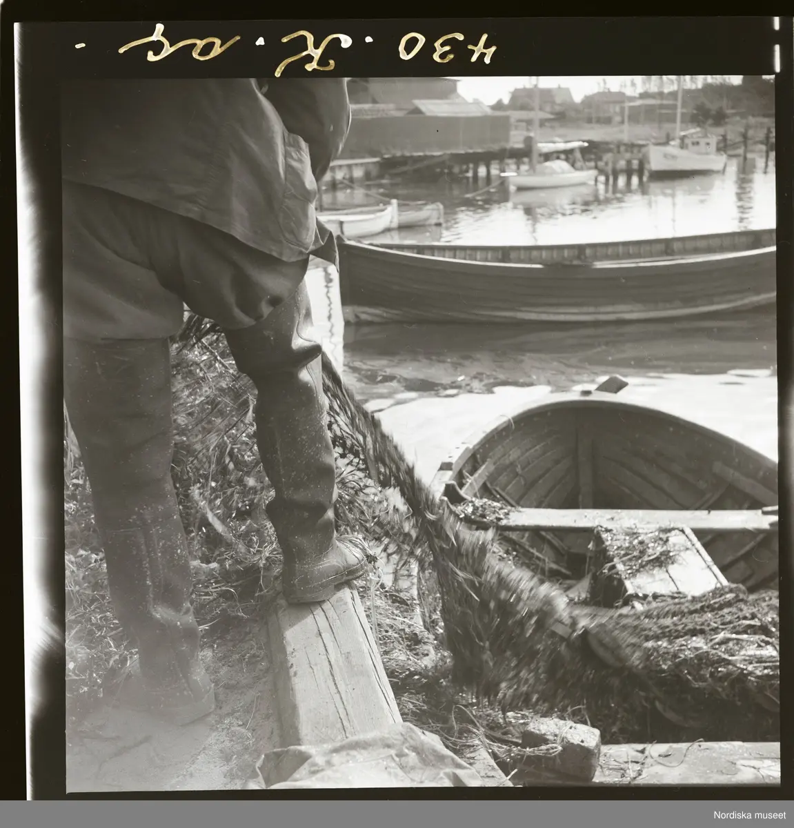 Text på montering i arkivet: Bottengarnen halas av laget från båten upp på bonden Ingels vagn och köras till torkplatsen vid Åkroken.