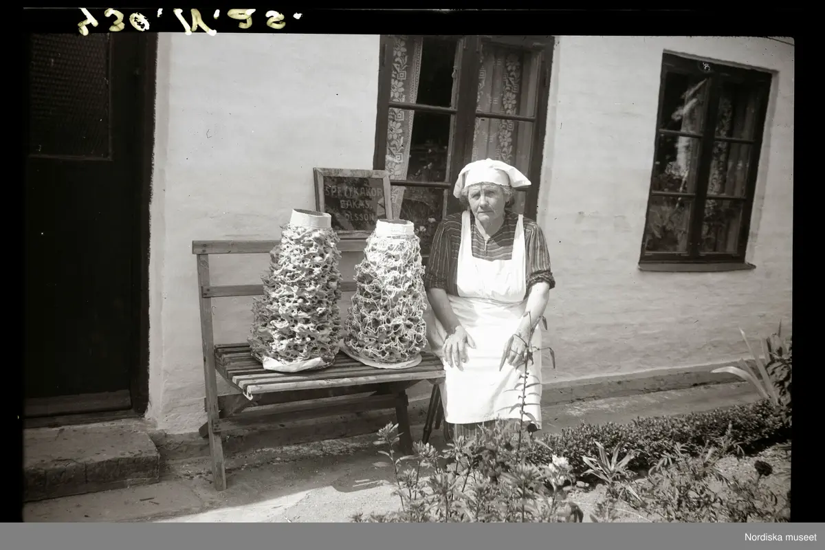 En kvinna sitter utanför E. Olsson bageri. På bänken intill henne står två spettekakor.