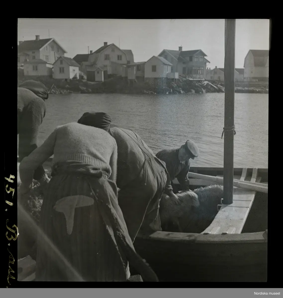 Från fiskehamnen har Karl Olsson och sonen Albert med jullen farit till Väster i vika och lagt till vid Sniken eller Yttre Snikebryggan, där fåren tas ombord för att föras över till sommarens betesholme, Kongsö. I bakgrunden bebyggelsen på halvön Kattholmen. De tolv fåren, 4 gamla tackor och 8 ungdjur, ryms nätt och jämt mellan tofterna. Gamla Karl Olsson håller dem lugna med bröd under överresan.