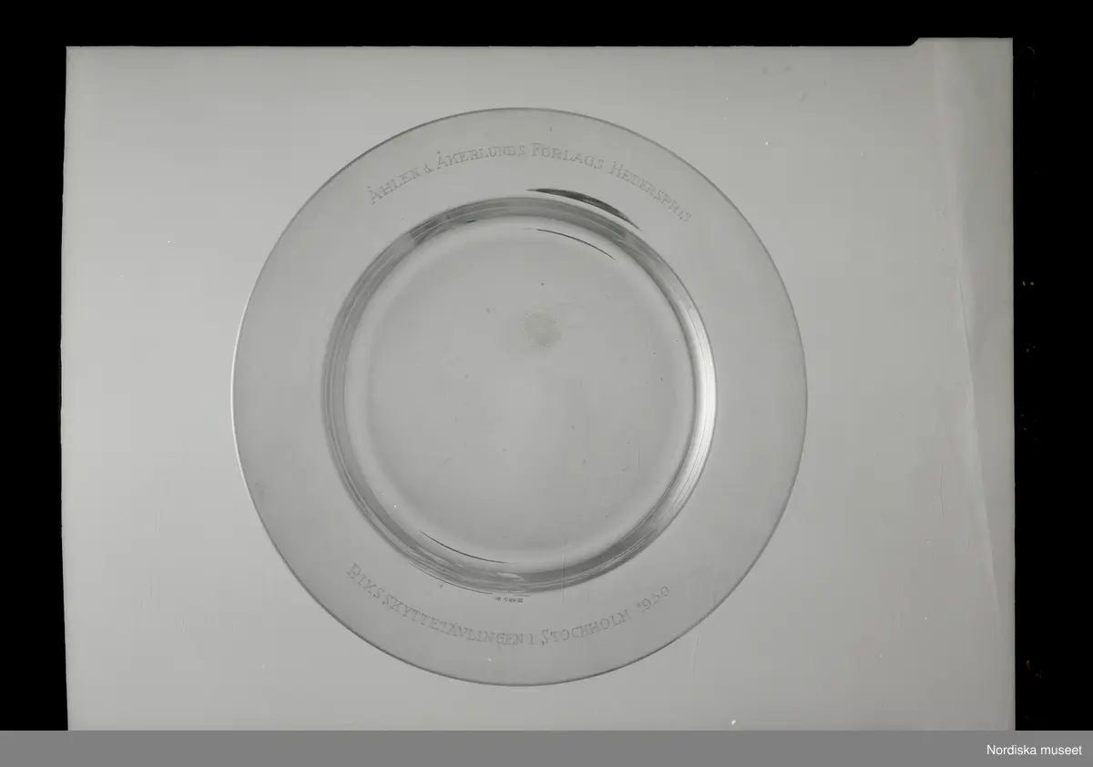 Silvertallrik "Åhlén & Åkerlunds förlags hederspris. Riksskyttetävlingen i Stockholm 1950"