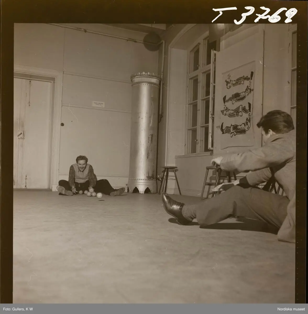 1677 B Konstfackskolan (tösen Boheman). Lek och spel i ateljén. Två manliga elever sitter på golvet och rullar bollar emellan sig.