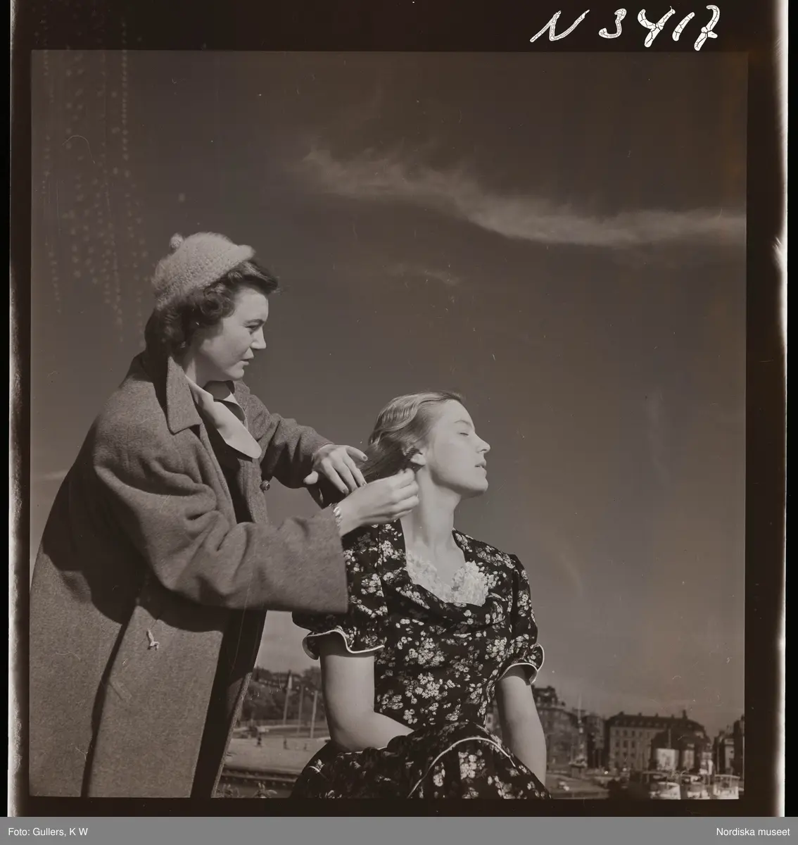 1708 N Mölnlycke väverier, mode; Stadshusträdgården, Stockholm; Mode för Mölnlycke. En kvinna rättar till modellens frisyr.