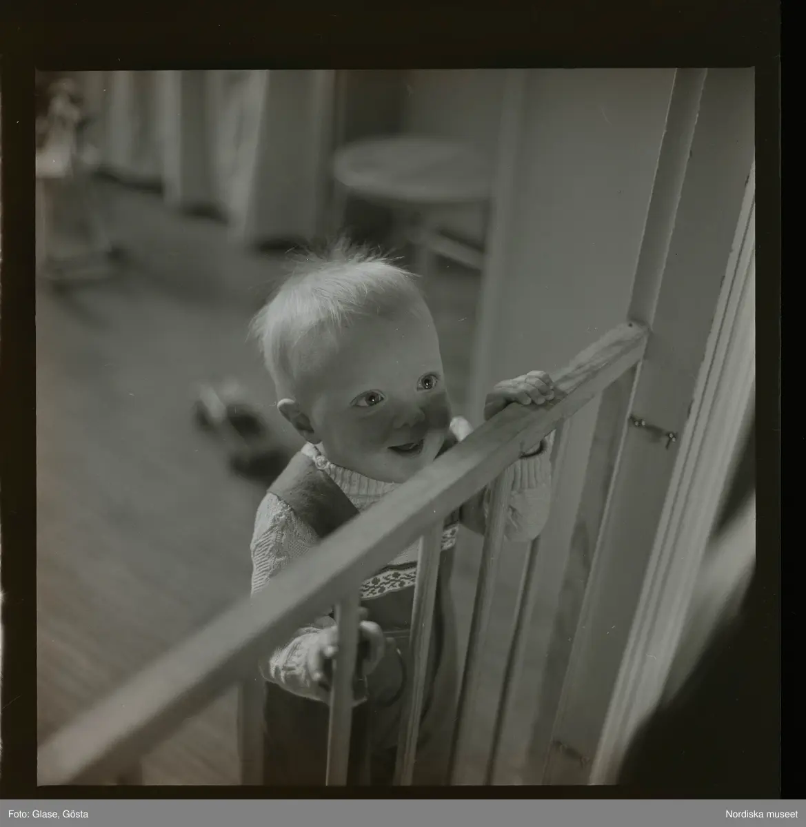 Ett litet barn står vid en grind uppsatt i dörröppningen till ett rum.