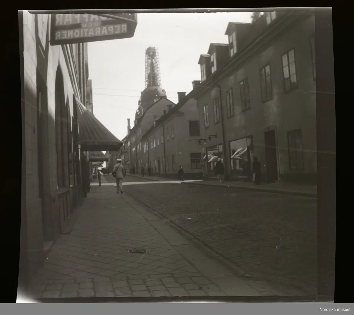 Högbergsgatan. Katarina kyrka med byggnadsställningar kring tornet. Södermalm, Stockholm.