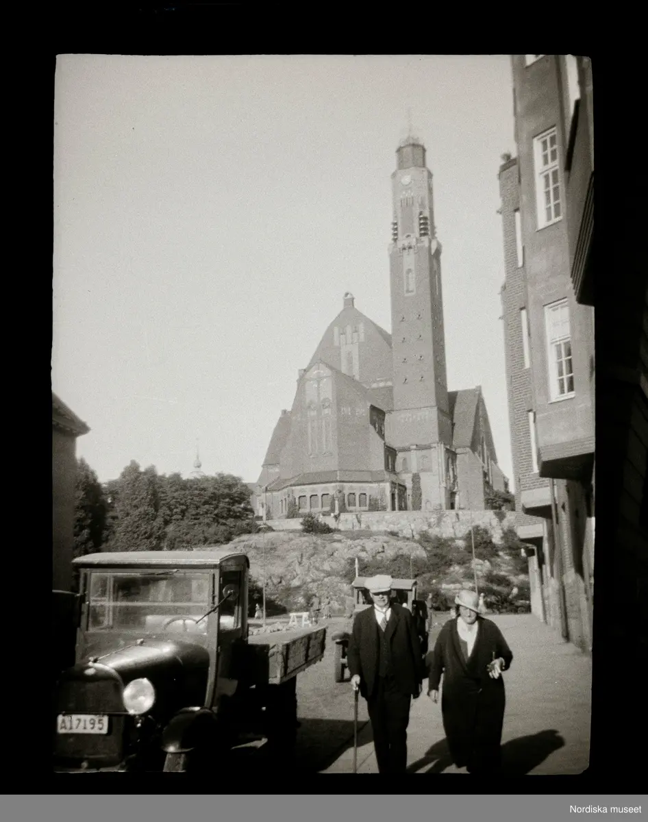 En man och en kvinna kommer gåendes på gata framför Engelbrektskyrkan, Stockholm.