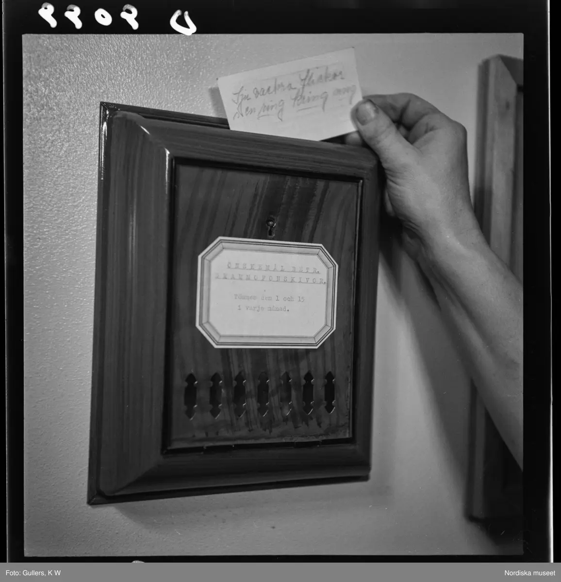 En låda uppsatt på en vägg för "Önskemål om grammofonskivor" i tekoindustrin på Borås Wäfveri.