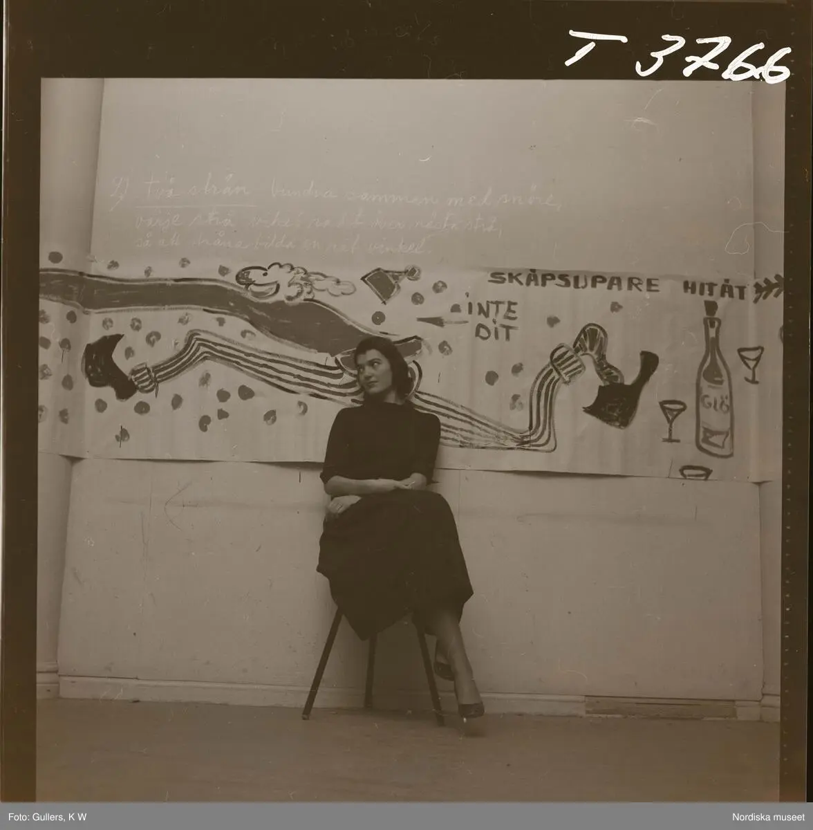 Titel: 1677 B Konstfackskolan (tösen Boheman) sittandes på pall framför målad fest-dekor.