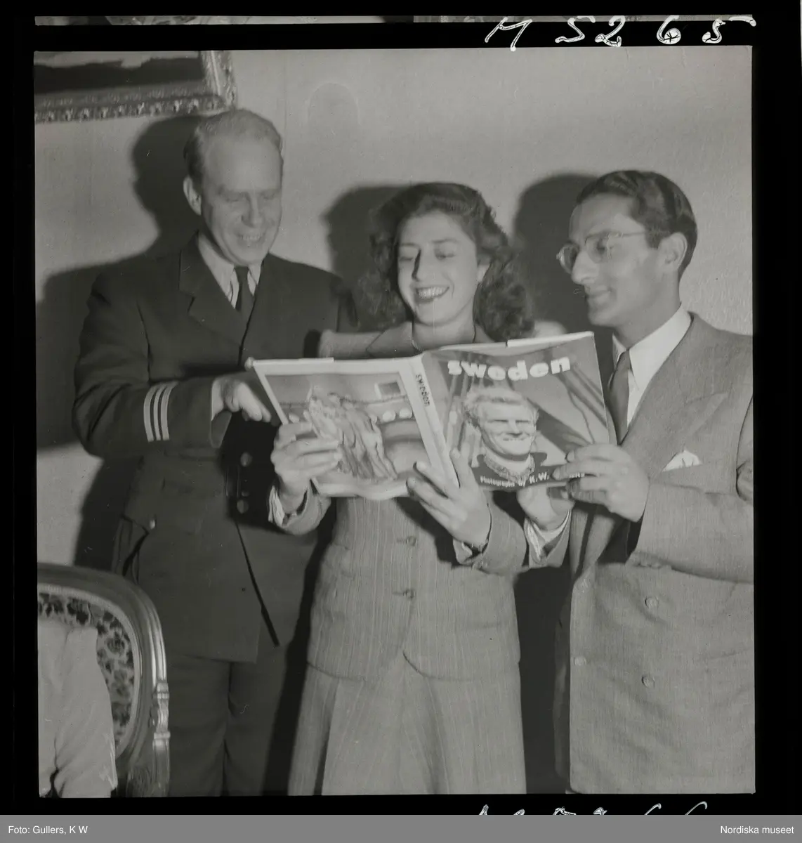 Istanbul. En kvinna och två män läser i boken "Sweden" med foton av K W Gullers.