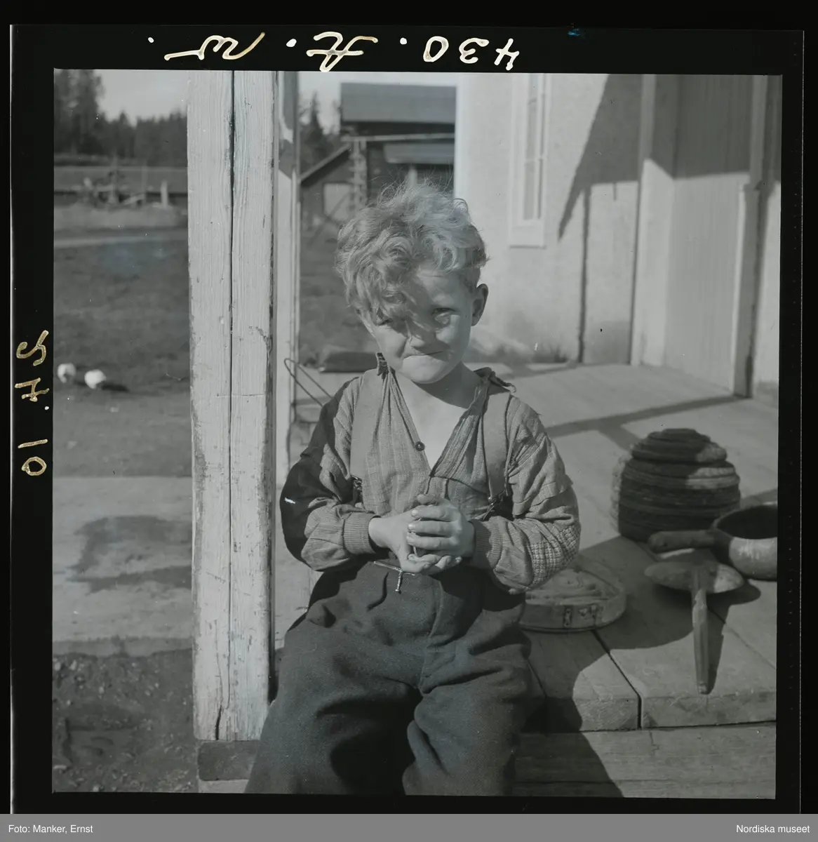 Per Arne, f. 1935. En pojke sitter på farstubro. På byordningsmannen Frans Perssons gård i Purnu, Gällivare skogssameby.