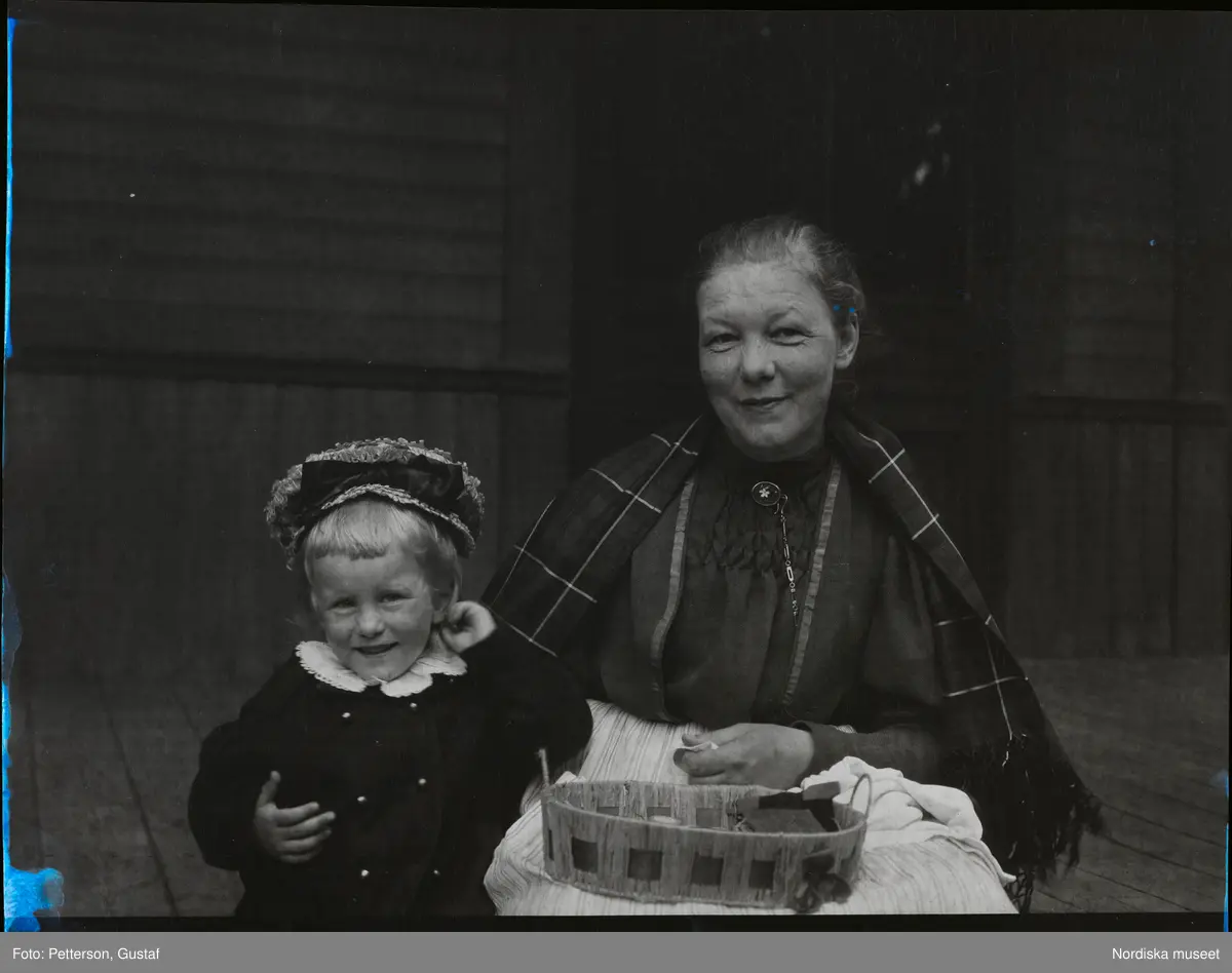 Anna Magdalena Amalia Petterson sitter intill en liten pojke på en trapp/ altan. I knät har hon en korg för handarbete.