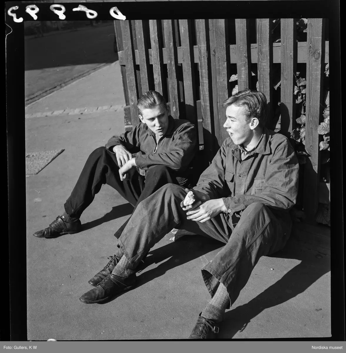 539 Söder. Två unga män sitter på gatan lutande mot ett staket.