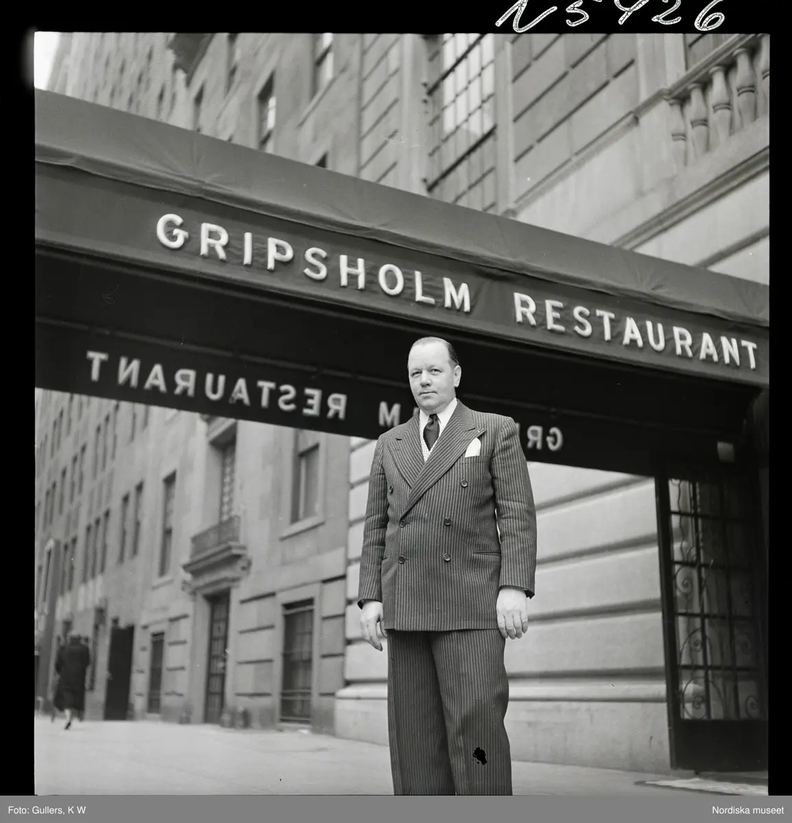 1690 New York allmänt (N.Y. Herald Tribune). En man står på trottoaren framför Gripsholm restaurang.