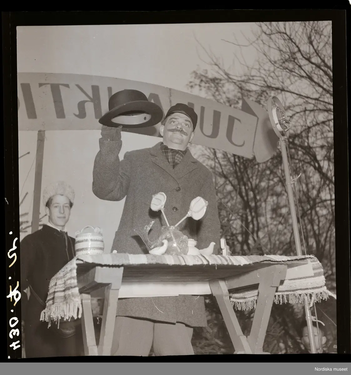 Julauktion på Skansen, Stockholm. Auktionsförättaren står med en hatt i handen bakom ett bord med saker.
