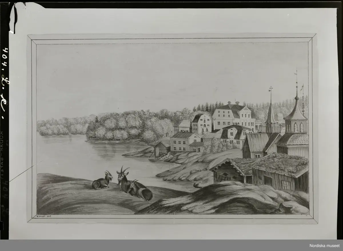 Foto av målning föreställandes ett samhälle vid vatten, utförd av W. Arppe, 1860.