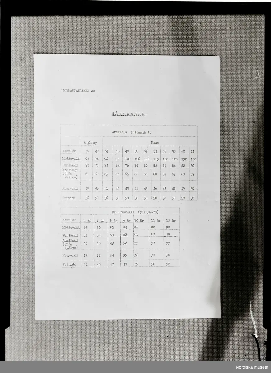 Måttabell, Slitmanfabriken AB. Plaggmått för overaller, man och barn. Dokumentation av Slitmanfabriken ABs verksamhet.