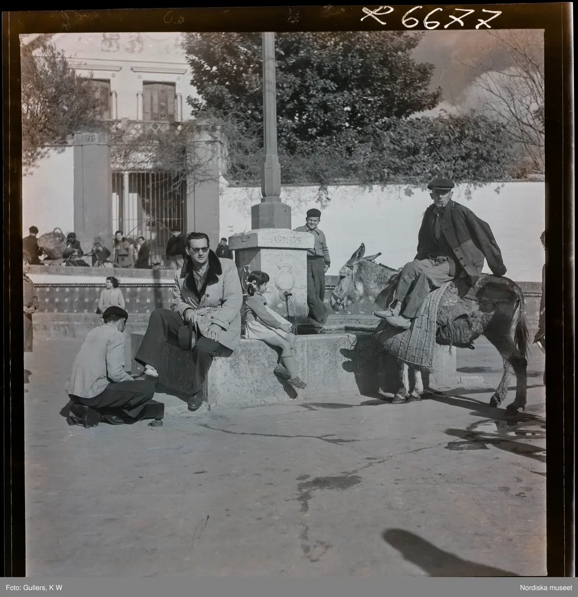 568 F. Stieg Trenter, Torremolinos. Människor samlade runt en springbrunn på ett torg. Stieg Trenter får sina skor putsade.