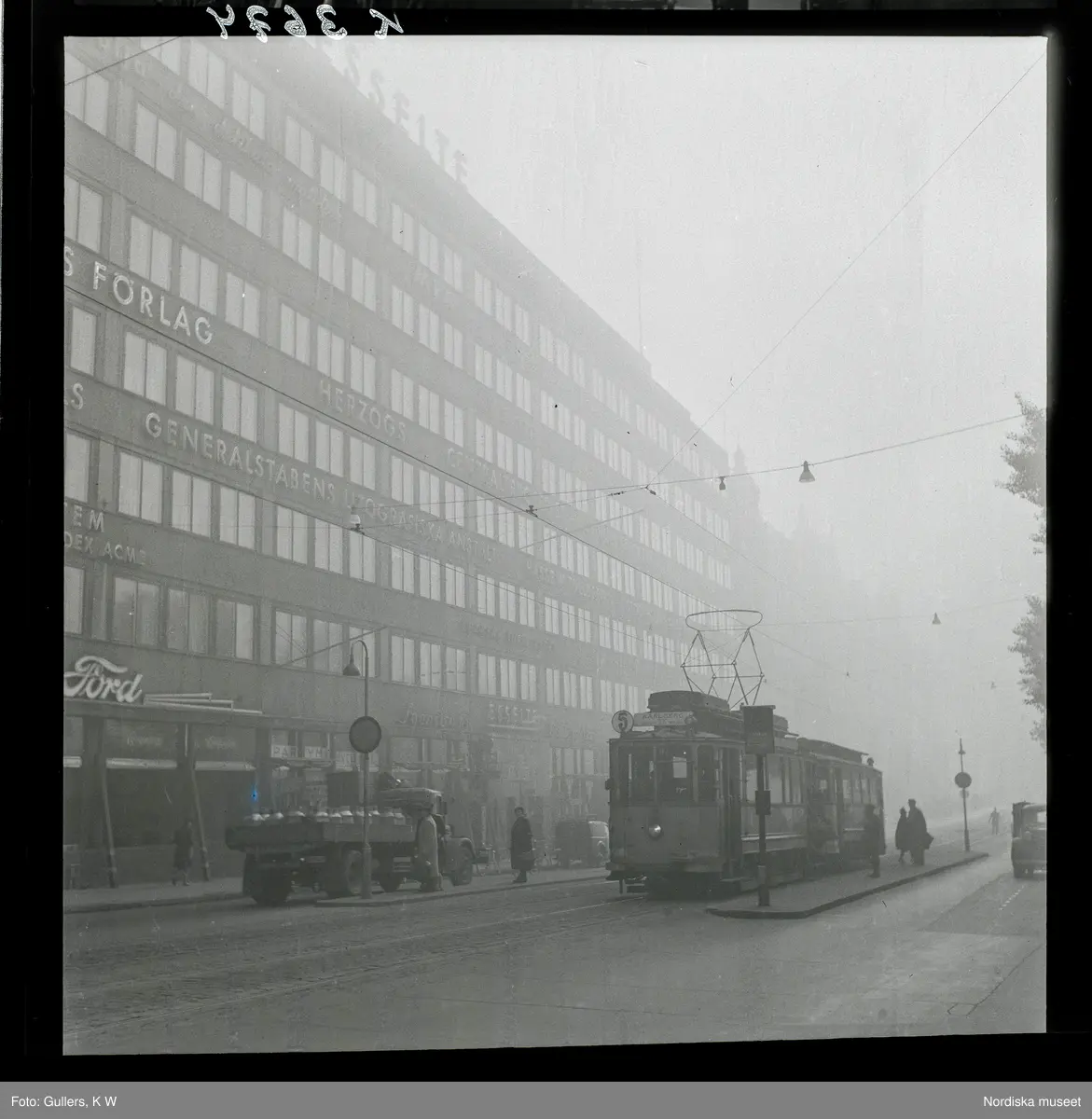 542/B Dimma. Spårvagn linje 5 vid hållplats. Byggnaden skyltar för Esselte på taket.
