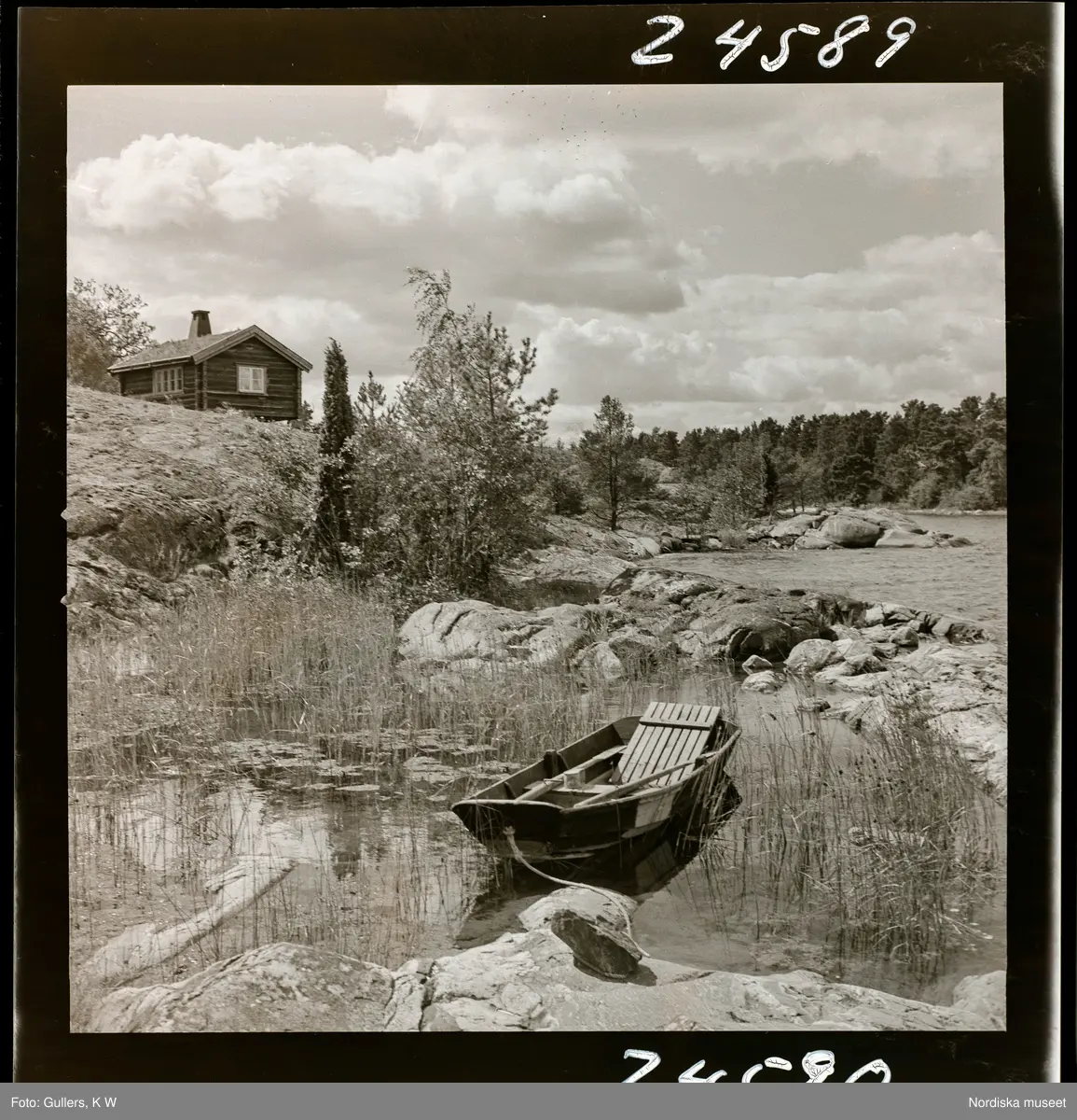 Titel: Ön Lilla Brudholmen. På en klippa ligger en stuga, i förgrunden ligger en båt. Fotografens förteckning/ anteckning: 568/1 Trenter Stieg Sommar-Gåtebo. Tagning ateljén.