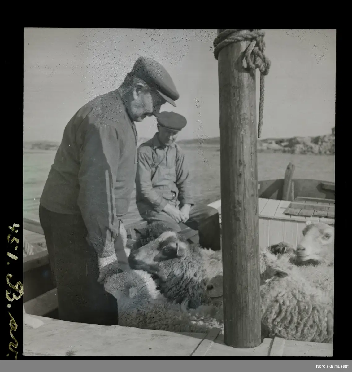 Från fiskehamnen har Karl Olsson och sonen Albert med jullen farit till Väster i vika och lagt till vid Sniken eller Yttre Snikebryggan, där fåren tas ombord för att föras över till sommarens betesholme, Kongsö. I bakgrunden bebyggelsen på halvön Kattholmen. De tolv fåren, 4 gamla tackor och 8 ungdjur, ryms nätt och jämt mellan tofterna. Gamla Karl Olsson håller dem lugna med bröd under överresan.