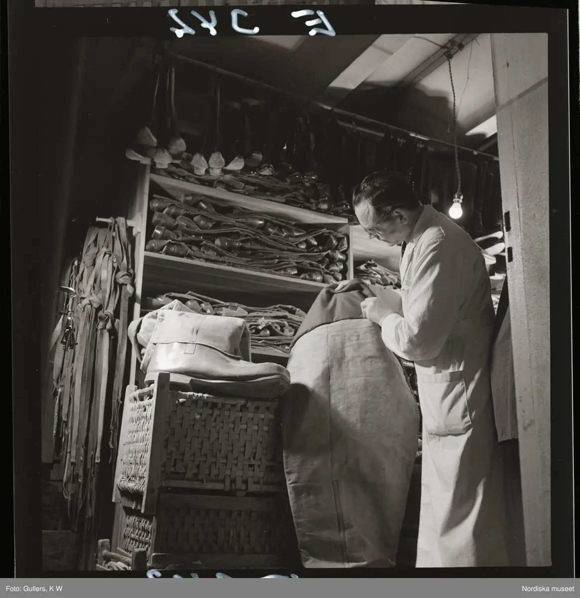 561 Operan för Allers. Kostymförråd. En man arbetar bland stövlar och skor.