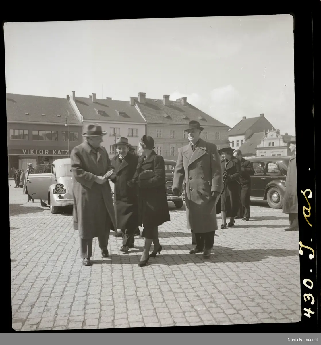 Titel: Nordiska museets utställning av folkkonst och Svenska slöjdföreningens utställning av modern svensk brukskonst i Prag, Tjeckien. Från en under utställningen anordnad utfärd. På bilderna syns professor Lundblom, fru Malmar, minister Malmar, konstnären Kåge.