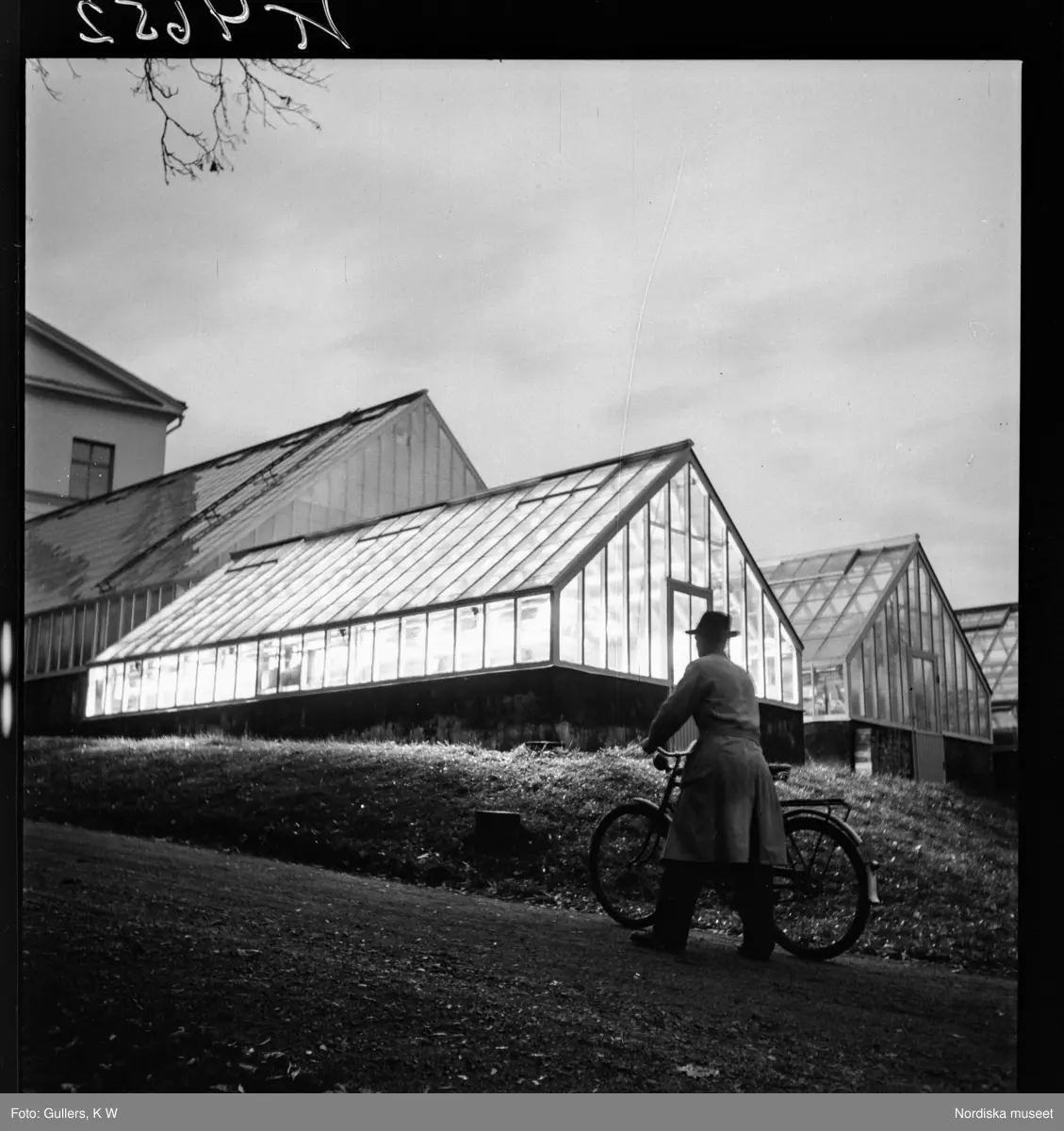 507 C Ultuna. En man med cykel framför ett växt-/drivhus.