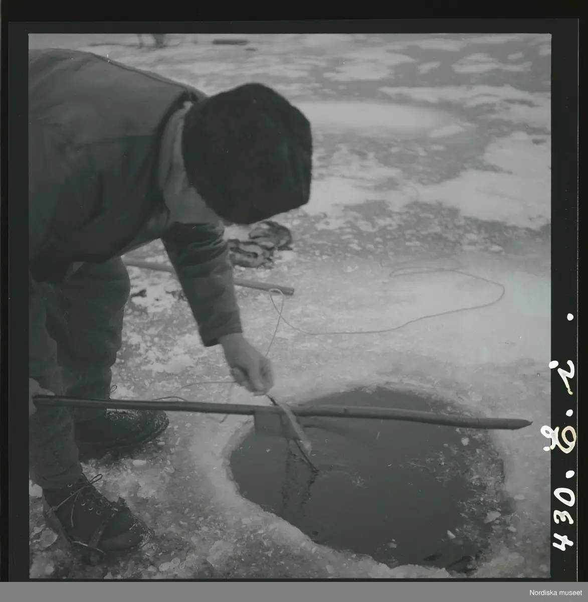 Vinterfiske på sjön. Det fiskas genom hål i isen.