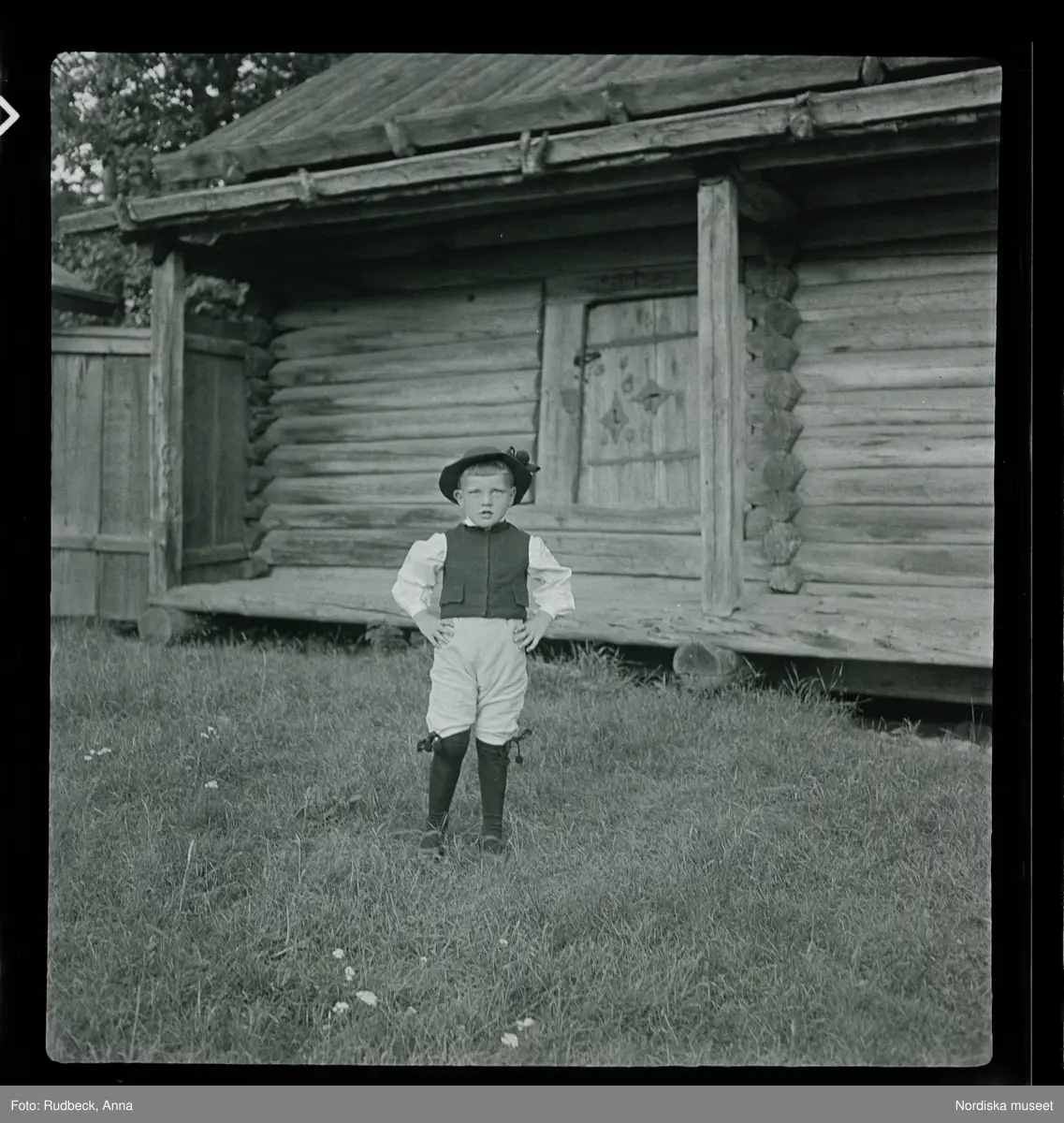 Titel: Skansen Ringleksbarn. En pojke i folkdräkt, utomhus på Skansen.