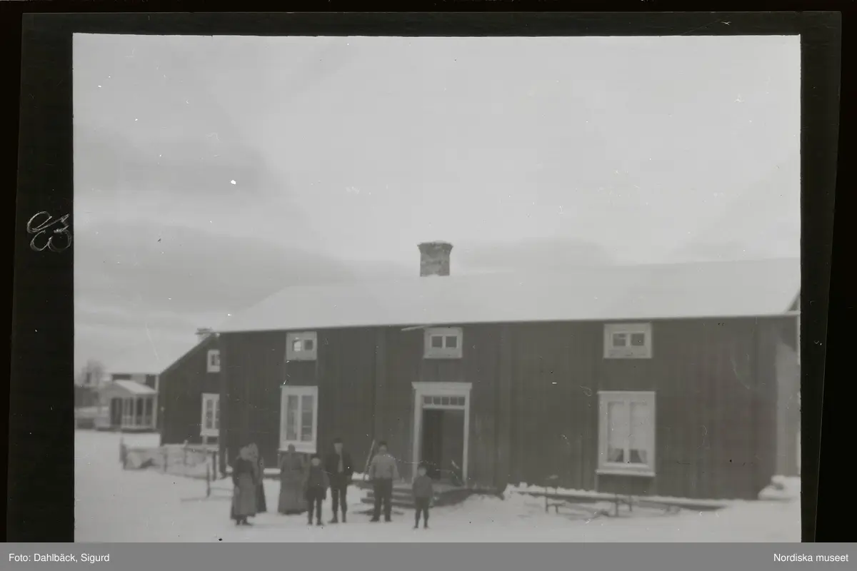 Fotografens anteckning: Karl Anton Holmbergs gård med h. h. Josefina Holmbegr 50 år, farmor Magdalena Holmberg 70 år, son Algot H. 11 år, son Tyko H. 9 år, dotterson t. Magdalena H.: Frans Pettersson 26 år, drängen Per Gustaf Andberg (infödd Holmöbo) 58 år, Alfred Karlssons hu. Thilda K. (Karlsson), f. Bäckström 40 år.