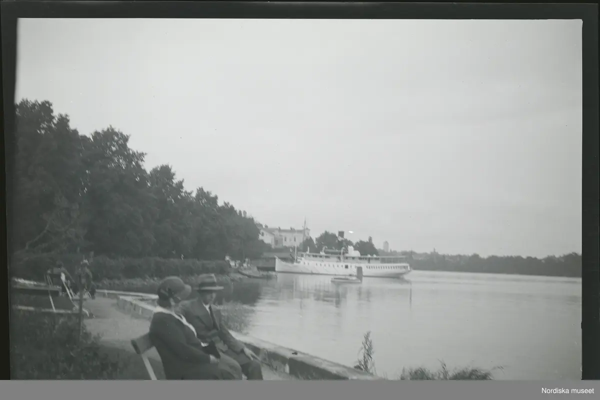 Ett par sitter på en bänk vid en kaj/ strandpromenad.